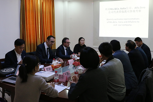 11月12日,Ma.&Co.Italia公司、Alfa Zero公司代表一行4人蒞臨我公司參觀(guān)考察。公司董事長(cháng)兼總經(jīng)理程曉華、總經(jīng)理蔡孝鋒、財務(wù)總監武繼峰隨行陪同。 來(lái)訪(fǎng)代表先后來(lái)到位于臨沂市國家高新區新華路西段的公司新廠(chǎng)址、科技產(chǎn)品展廳和科研實(shí)驗室,現場(chǎng)了解了公司的建設規模、施工情況和新產(chǎn)品研發(fā),對我公司產(chǎn)品和服務(wù)表示一致稱(chēng)贊。最后,來(lái)訪(fǎng)代表與公司領(lǐng)導在會(huì )議室進(jìn)行了親切交流,并希望與我公司建立長(cháng)期合作關(guān)系。